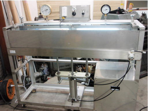 | 特 徴 | エアシリンダ―を用いて水槽を上下させ、バルブを水没させた 状態で気密試験を行う。 |